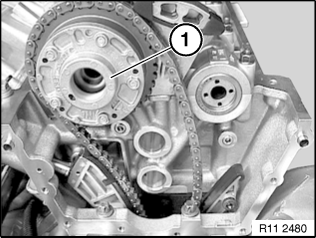 将进气调整装置 (1) 穿入正时链,然后安放到进气凸轮轴上。