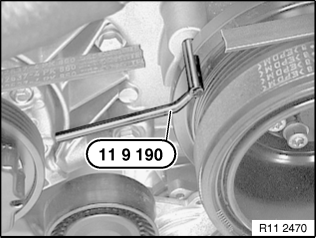 通过中心螺栓转动发动机,用专用工具 11 9 190 将减震器固定在气缸 1 的点火上止点位置。