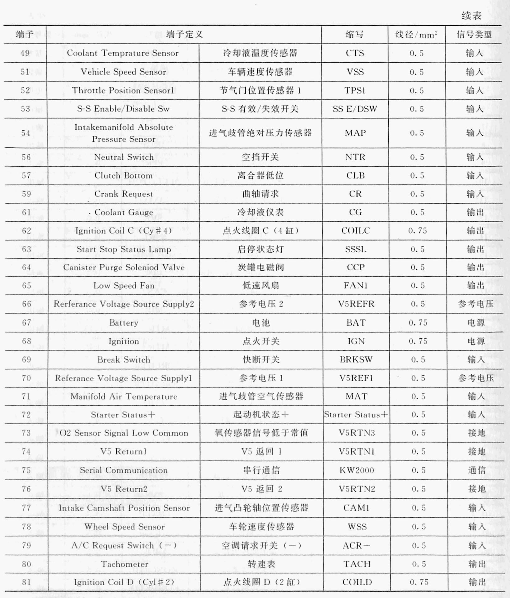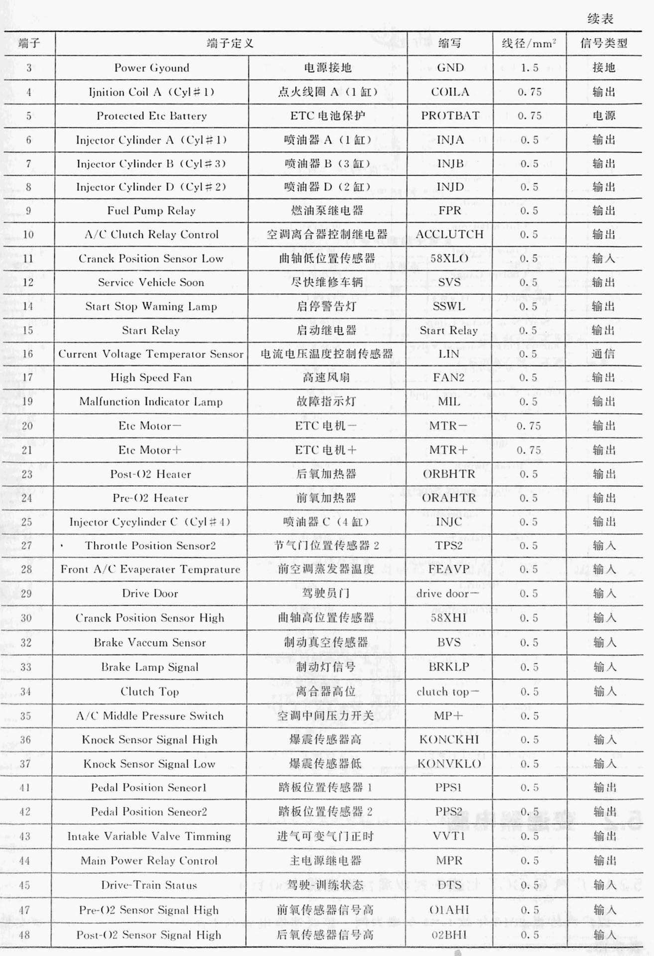 以吉利 2009 年款帝豪 EC7 车型为例,4G18 发动机电脑端子图如图 1-11 所示,端子定义见表1-19。