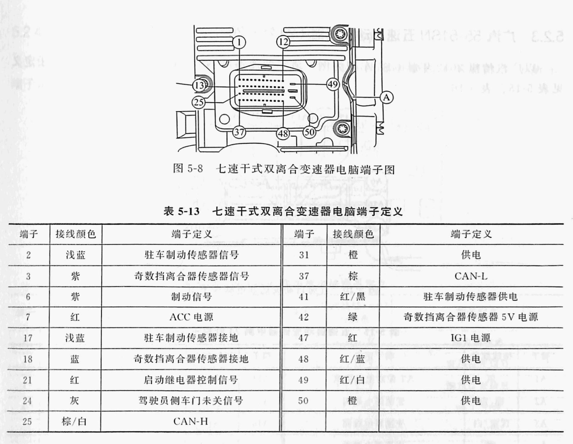 以广汽长丰2018年款猎豹MATTU车型为例,该变速器电脑端子图如图5-11所示.端子定义见表5-17。