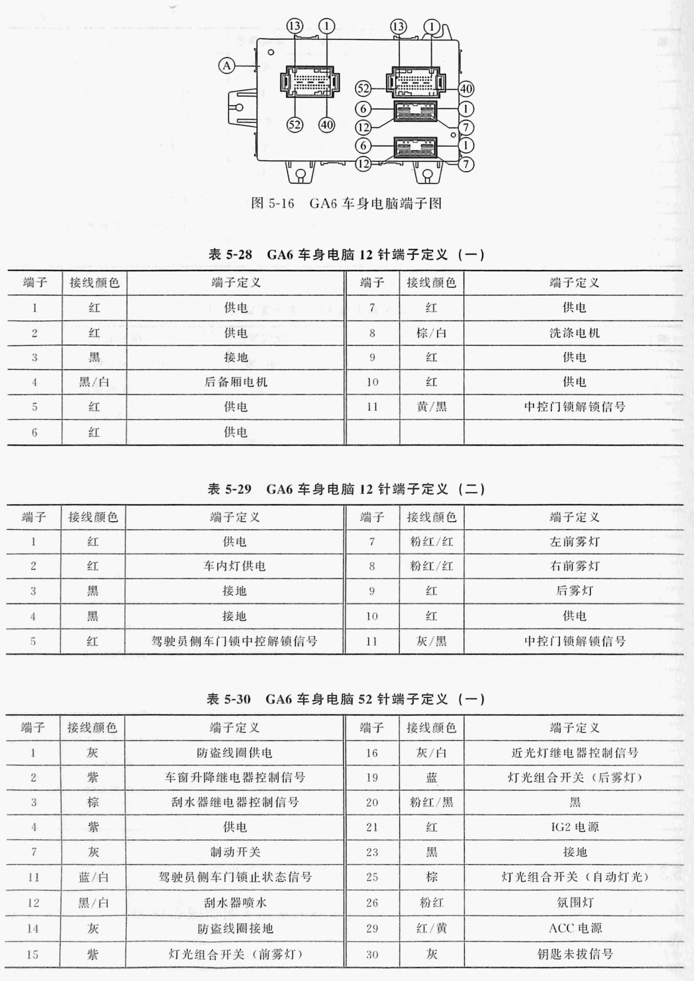 以广汽传祺2012年款GS5车型为例,该车变速器电脑端子图如图5-10所示,端子定义见表5-15、表5-16。