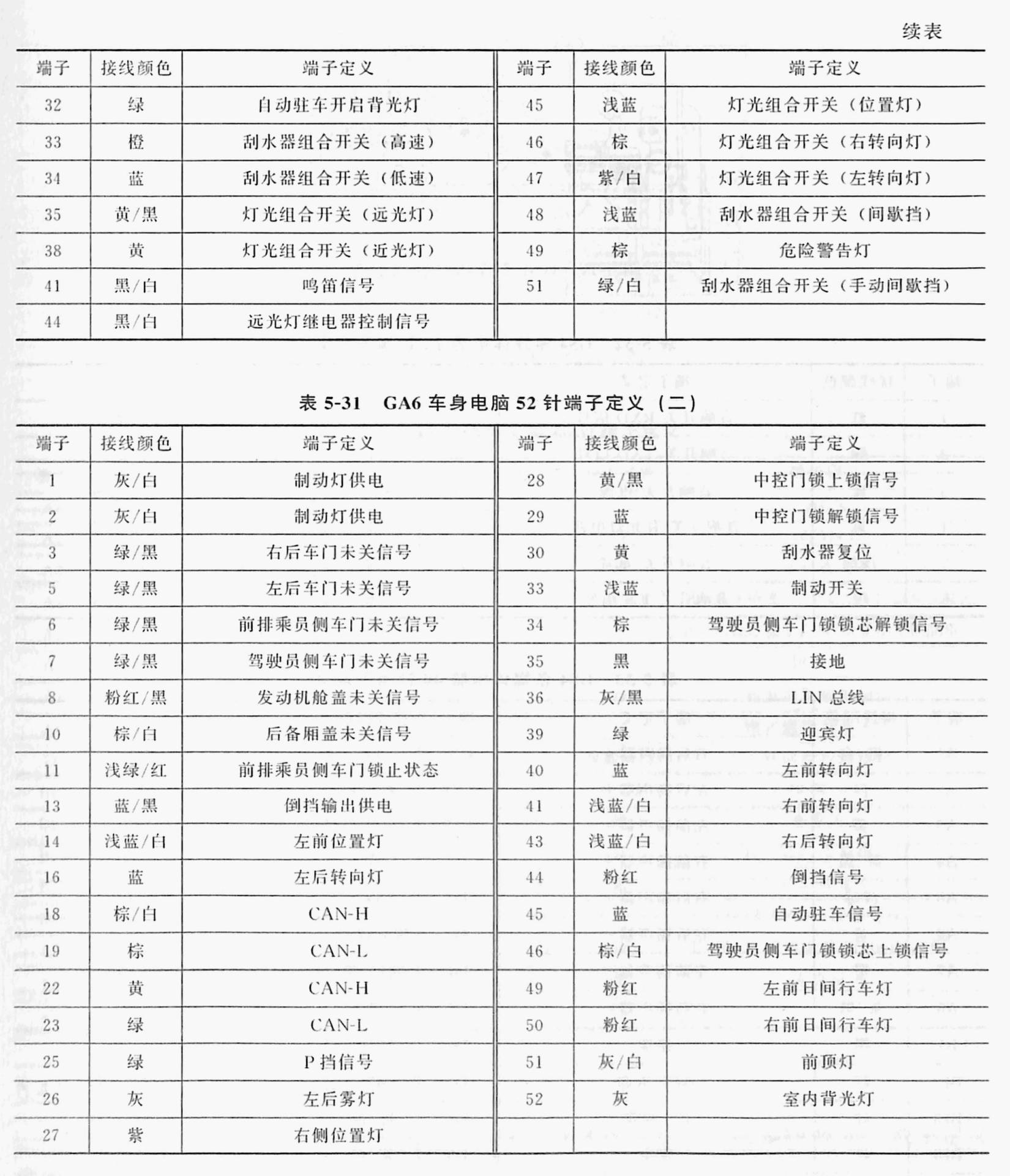 以广汽传祺2013年款GS5车型为例,4B20K2发动机电脑端子图如图5-5所示,端子定义见表5-9。