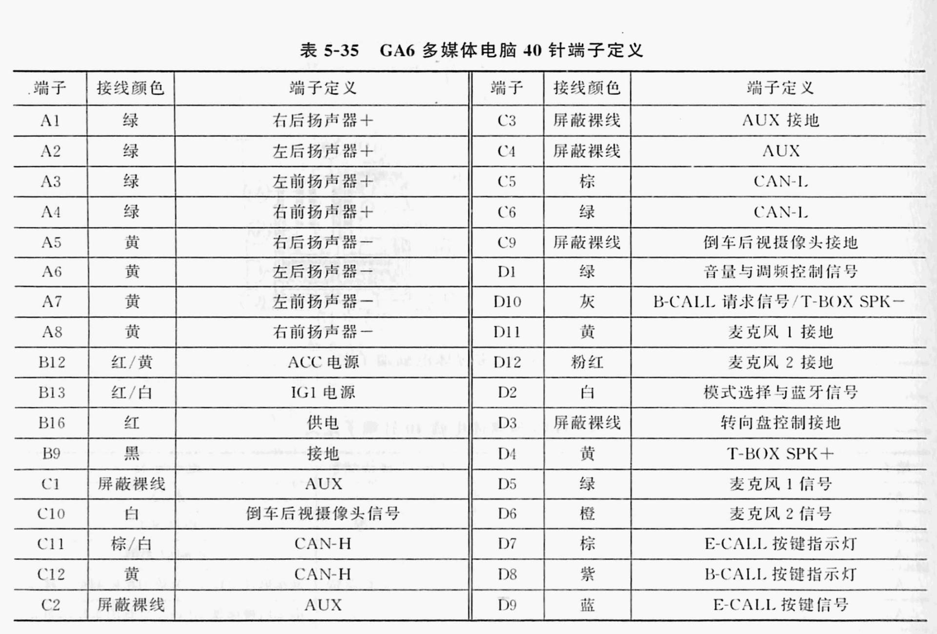 以广汽传祺2016年款GA6车型为例,其车身电脑端子图如图5-16所示,端子定义见表5-28~表5-31。
