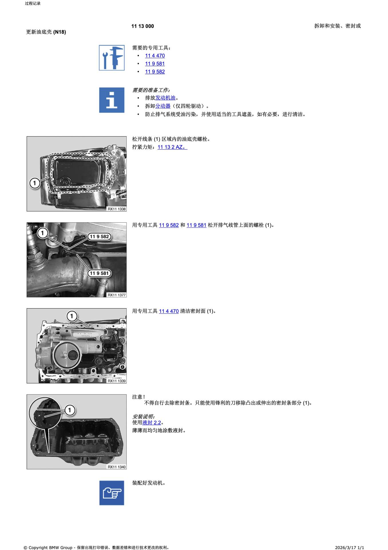 - 密封面处理:使用专用工具 11 4 470 清洁密封面 。