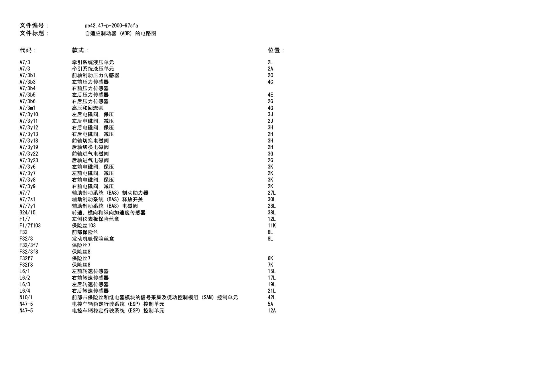 | 制动压力传感器 | 监测液压管路压力 | 集成在 ABR 液压单元内部。 |
