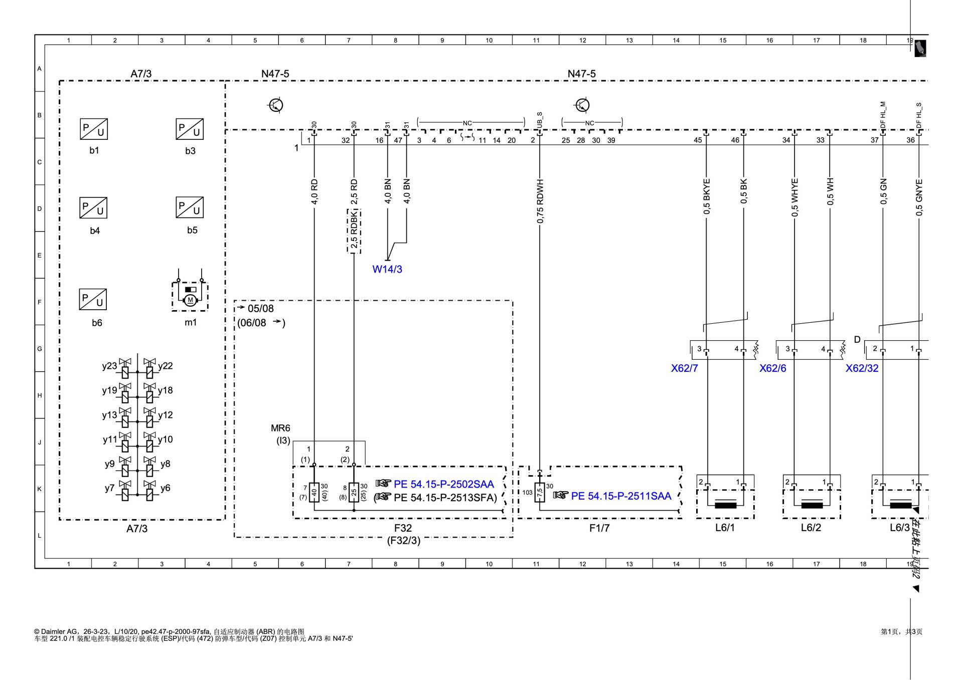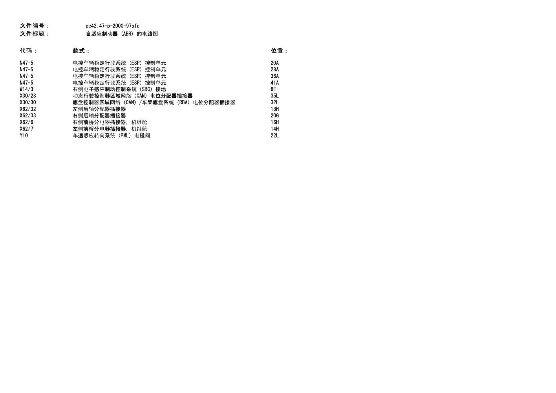 | 轮速传感器 (L6/1-L6/4) | 检测四个车轮的转速 | 有源传感器,两线制,直接连至 N47-5。 |