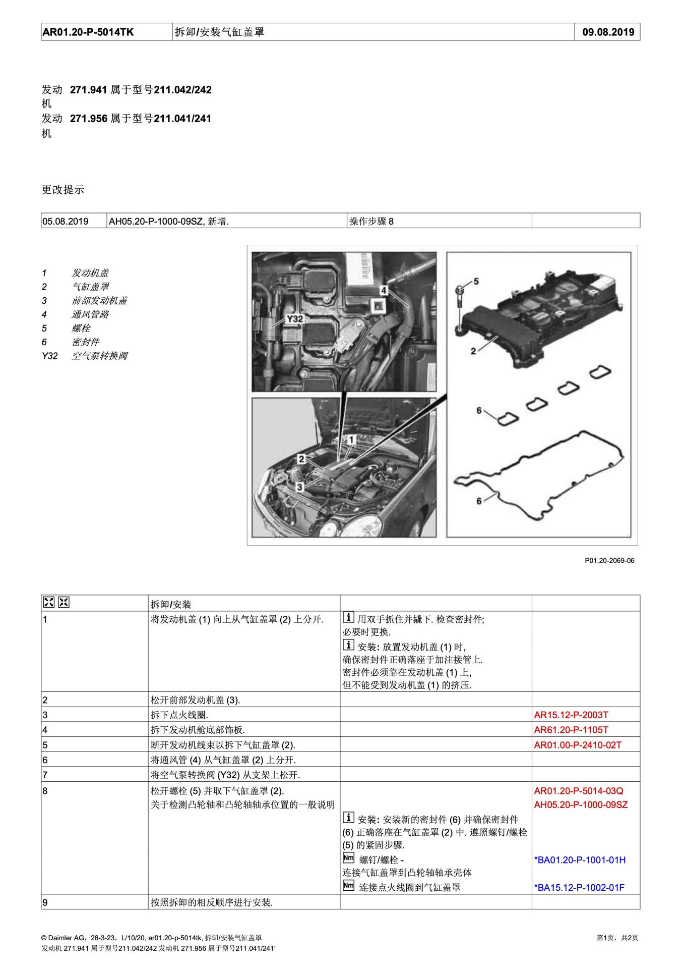 | BA01.20-P-1001-01H | 气缸盖罩 连接至 凸轮轴轴承壳体 | M271 | 9 Nm |